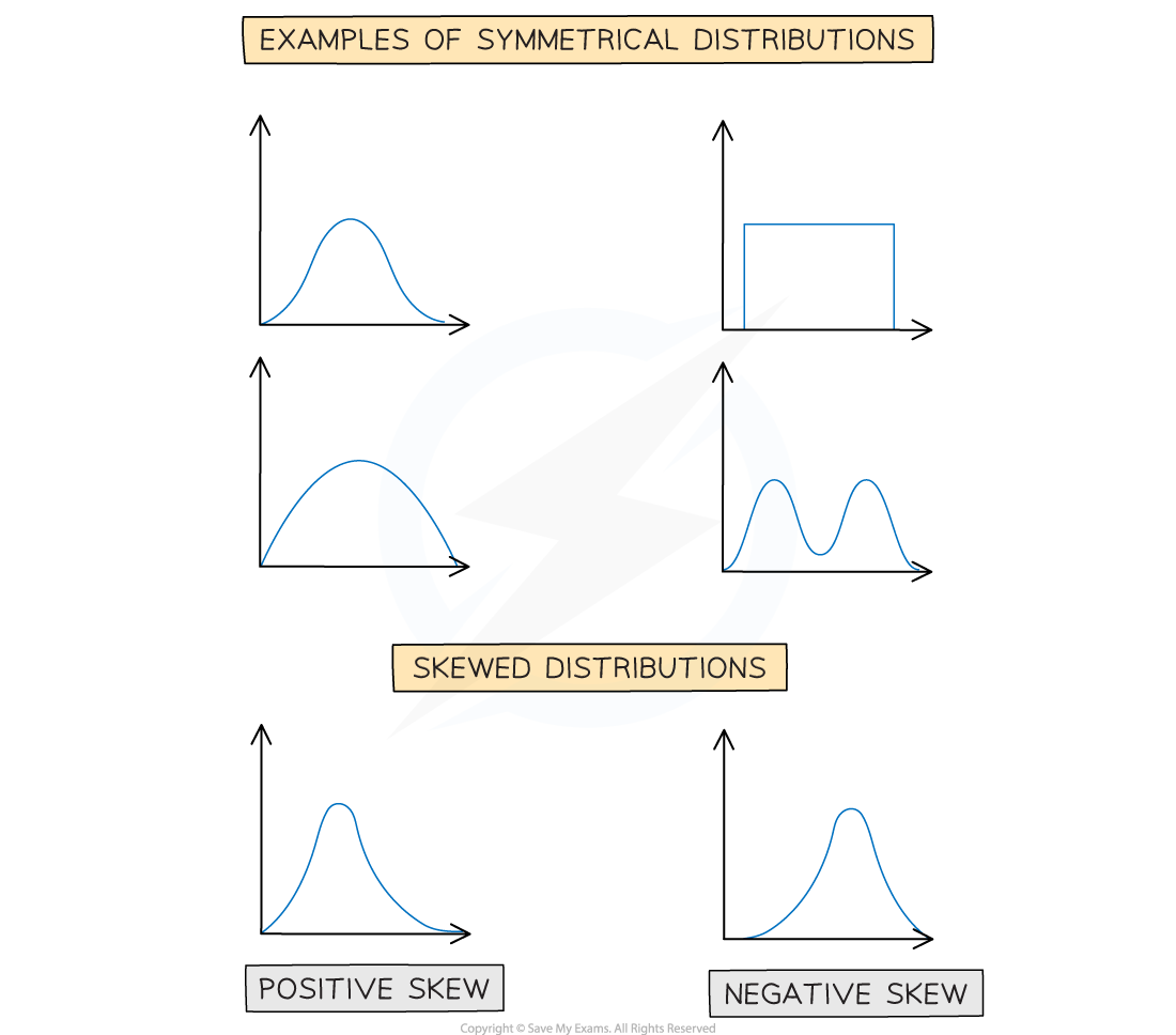 Graphical Representations¶ Skewness¶ Skewness → median & mean Symmetric → median \(\approx\) mean Positively skewed → median < mean Negatively skewed → median > mean