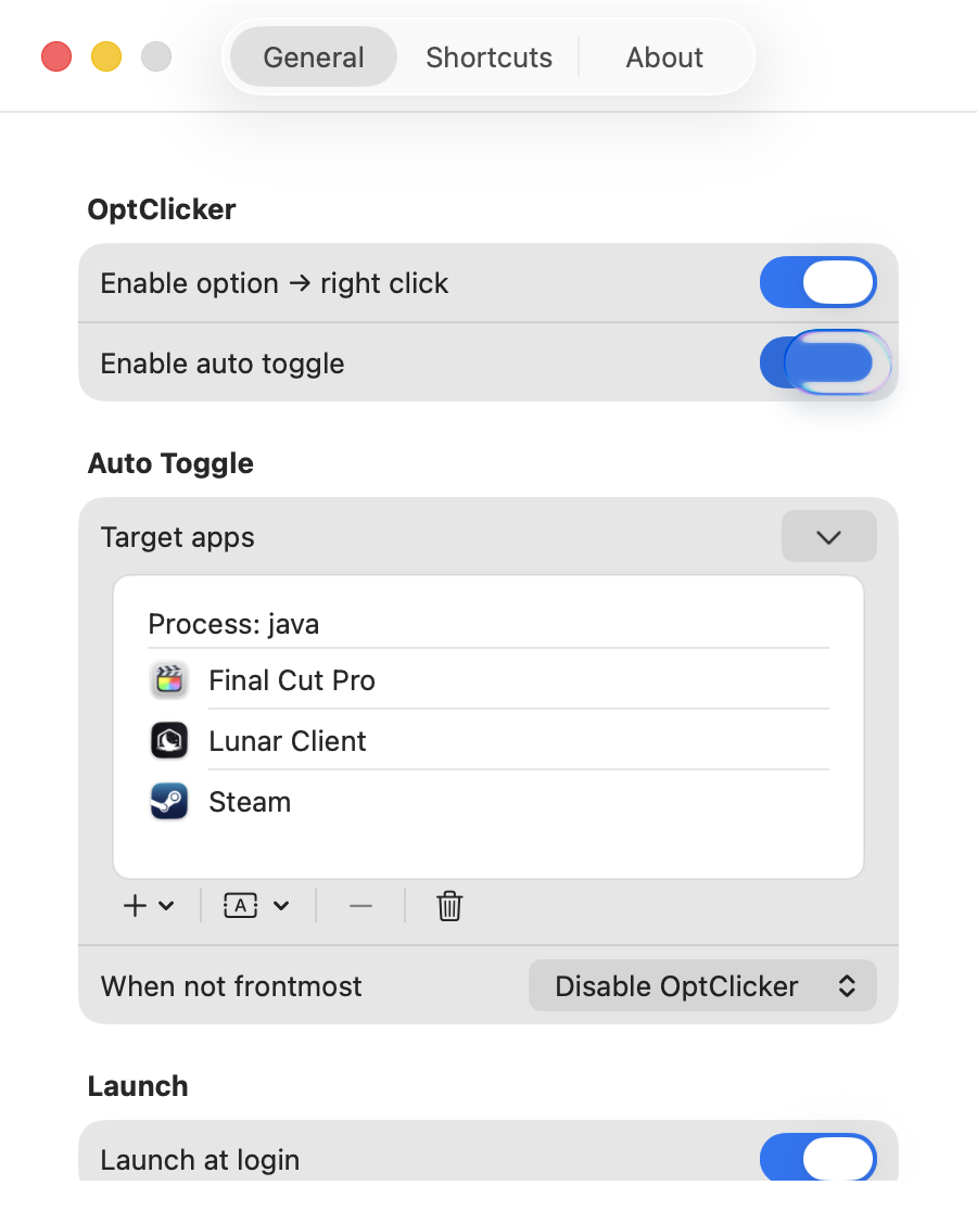 After enabling Auto Toggle, you can choose target apps that when they are in front, OptClicker will automatically be turned on. You can add your games, for instance.
